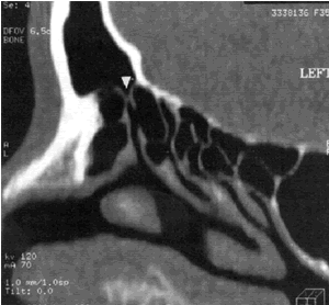 Fig.30 TC corte coronal. Hallazgo postoperatorio. A la izquierda del paciente una capa ósea de una celdilla de agger nasi no fue resecada resultando en una sinusitis frontal recurrente. En: Stammberger, H. Uncapping the egg. The endoscopic approach to frontal recess and sinuses. FESS.