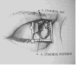 Se incide el periostio, se levanta y retrae lateralmente, liberando cuidadosamente la porción superior del saco lacrimal. Se expone toda la lámina papirácea y el piso del seno frontal. Se debe evitar el desgarro del periostio y de la fascia periorbitaria (especialmente en la sutura frontoetmoidal donde está bien adherida) para evitar la herniación de la grasa orbitaria. Se colocan separadores. Se ligan las arterias etmoidales anterior y posterior (fig.16) (11).
