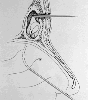 Anestesia general. Infiltración de lidocaína con epinefrina. Incisión curvilínea de 2,5 a 3,5 cm de largo a 1cm por debajo del nivel del ligamento palpebral interno (fig.15). Se realiza una tarsorrafia temporaria para protección del globo ocular. Se expone los músculos orbicular de los párpados y porción superior del elevador propio del labio superior y también los vasos palpebrales superiores (ramas de los vasos angulares) que se ligan o electrocoagulan. Se expone y preserva el ligamento palpebral interno (9,11).