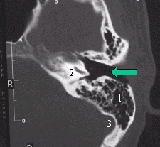 1-Caja timpánica aereada 2-Carótida 3-Conducto auditivo externo obliterado
