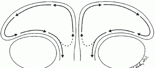 Fig.9 Esquema que muestra la circulación fisiológica del moco en el SF. En: Kennedy, D. Cap 22. Cirurgia do Seio Frontal. En: Doencas dos Seios Paranasais. Sao Paulo. Ed: Revinter, 2004. p:281-302.