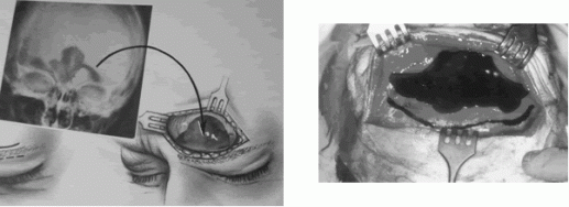 Debe hacerse la incisión por encima del ligamento angular interno evitando lesionar el ojo. La trepanación se hace en el piso o cerca del mismo. No debe irrigarse si existe una dehiscencia del techo ya que puede ser causa de ceguera (11).